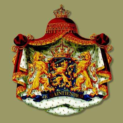 荷蘭國徽是一頂紅色貂皮懈”(Je Maintiendrai?。┑乃{(lán)色飾帶,兩只跨立的金獅翹著尾巴,口吐紅舌護(hù)著一面藍(lán)色盾徽。盾徽頂部是威廉一世御璽上所用的王冠;后面中央繪有一只頭戴王冠的金獅,右前肢揮舞著一把出鞘的利劍,左前肢揮動一束金色箭翎,它們象征著國王權(quán)力。華蓋如開啟的幕布,下部嵌有一條寫著威廉親王誓言“堅持不懈”。