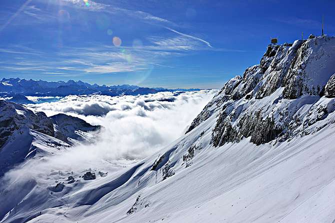 Alpnachstad以上的山體陡峭嶙峋,上山途中市場可以看見巖羊出沒,也是徒步愛好者喜愛的登山線路。熟練的登山者登頂需花費(fèi)5-6小時。途中有一次機(jī)會在Aemsigen站搭乘登山列車。山頂有一家三星酒店Hotel Bellevue和一家位于百年歷史建筑里的精品酒店Hotel Pilatus-Kulm,數(shù)家餐廳,多功能廳,“龍之論壇”會議室,紀(jì)念品店,室內(nèi)觀景長廊,室外觀景大露臺。喜愛徒步的游客,還可以沿山頂數(shù)條步行道登上最高點(diǎn)。在山頂?shù)木吧浅延^,令人心潮澎湃,贊嘆大自然的鬼斧神工:阿爾卑斯諸峰的雪頂漂浮在云端,仙氣飄飄;俯視,琉森湖和琉森老城盡收眼底;向北,可以看見數(shù)個翠玉般的湖畔,然后是蘇黎世,巴塞爾目力將直達(dá)德國黑森林。Kriens一側(cè)的山體比較平緩,有數(shù)個牧場。在Fraekmuentegg纜車換乘站有瑞士境內(nèi)最長的旱地雪橇道(summer toboggan, 1.35公里)和瑞士中部最大的繩索攀爬樂園。冬季也可以在此租借雪橇椅,滑雪橇下行到Kriens站。