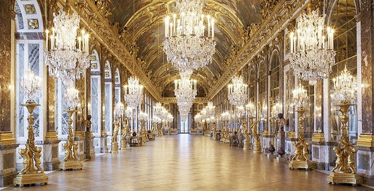 鏡廳曾被廣泛認(rèn)為是無(wú)上權(quán)力的象征,1678年路易十四讓他的建筑師兼城市規(guī)劃師芒薩爾為凡爾賽宮設(shè)計(jì)了最豪華瑰麗的殿堂鏡廳。廳內(nèi)長(zhǎng)廊一側(cè)是17扇朝花園而開(kāi)的巨大拱形窗門(mén)。版權(quán)所有山東聊城聊之旅國(guó)際旅行社有限公司,轉(zhuǎn)載必究!另一側(cè)是由483塊鏡片鑲嵌而成的17面落地鏡,它們與拱形窗門(mén)一一對(duì)稱,把門(mén)窗外的藍(lán)天、景物完全映照出來(lái)。同時(shí)廳內(nèi)3排掛燭上32座多支燭臺(tái)及8座可插150支蠟燭的高燭臺(tái)所點(diǎn)燃的蠟燭,經(jīng)鏡面反射,形成約3000支燭光,把整個(gè)大廳照得金碧輝煌。當(dāng)時(shí)鏡廳是宮廷舉行大型招待會(huì)和國(guó)王接見(jiàn)高級(jí)使團(tuán)的場(chǎng)所,而整個(gè)凡爾賽宮則成為國(guó)王和貴族、大臣們飲酒作樂(lè),享受豪華奢侈生活的場(chǎng)所。