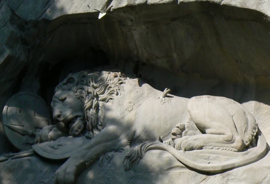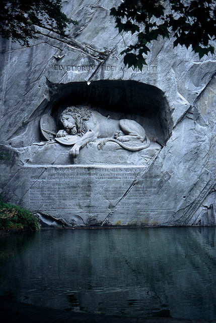 獅子紀(jì)念碑(Lion Monument)是琉森(盧塞恩)數(shù)一數(shù)二的雕刻作品,一支箭深深地插進(jìn)了瀕臨死亡的雄獅背上,獅子面露痛苦的神情,前爪按盾牌和長(zhǎng)矛,盾牌上有瑞士國(guó)徽。