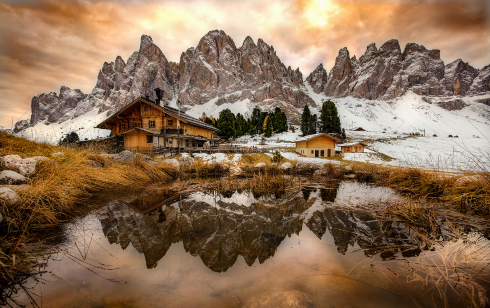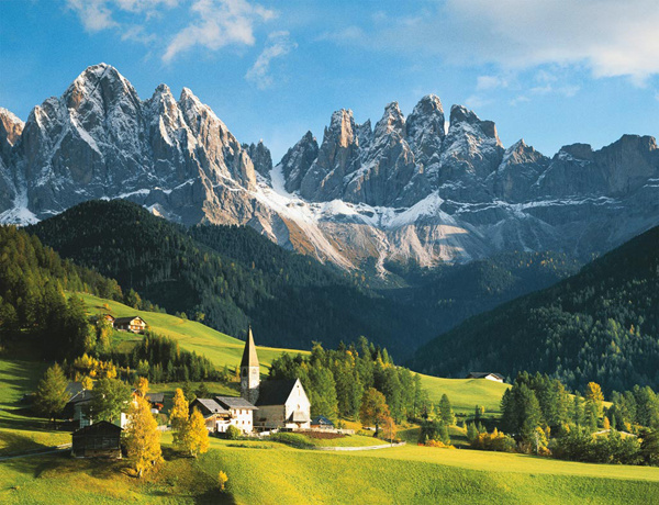 奇峰林立、巍峨莊嚴(yán)的群山屹立于意大利、德國(guó)和當(dāng)?shù)乩刂Z (Ladino) 文化的交叉口。此山又名“白山”,這個(gè)名字得自于潔白無(wú)瑕的白云石,但每至破曉和日落時(shí)分,山中萬(wàn)物都會(huì)染上一層粉紅色,接著漸變?yōu)榘导t色—— 這種現(xiàn)象被稱為阿爾卑斯之光 (enrosadira),多洛米蒂因此而聞名于世。布倫塔 (Brenta) 群山位于多洛米蒂山區(qū)最西端,山中坐落著旅游勝地——摩敦納迪-坎皮格里奧 (Madonna di Campiglio)(隸屬于特倫托 (Trento) 地區(qū))。 但據(jù)官方宣傳,多洛米蒂山最迷人的自然風(fēng)光是特倫托東部位于西斯蒙山谷 (Val Cismon) 和費(fèi)耶美-法薩山谷 (Fiemme and Fassa Valleys) 之間的山區(qū)。 再往前走我們可以看到圣馬蒂諾-卡斯特羅扎山,它緊鄰佩爾-圣馬蒂諾山 (Pale di San Martino) 和菲拉-普里梅羅 (Fiera di Primero) 山,坐落于費(fèi)耶美-法薩山谷之中,周圍環(huán)繞著塞拉 (Sella)、薩索倫高 (Sassolungo)、馬爾莫拉達(dá)(Marmolada)、摩埃納 (Moena) 和卡納澤伊 (Canazei) 等眾多山峰。 朝北走,可以看到加爾代納山谷 (Val Gardena),它隸屬于博爾扎諾省 (Bolzano),山谷兩旁依偎著美麗的奧蒂賽依市 (Ortisei) 和迷人的圣克里斯蒂娜市 (Santa Cristina) 與塞爾瓦市 (Selva)。