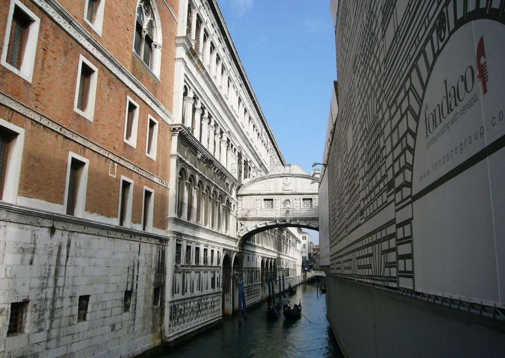 據(jù)說(shuō)到威尼斯的人,一定要坐威尼斯小艇;坐威尼斯小艇的情侶,一定要經(jīng)過(guò)“嘆息橋”,且在橋下?lián)砦?。“嘆息橋”不像威尼斯的幾百座橋,供行人穿越。它是座橋,也橫過(guò)水面,但高高懸在兩棟樓宇之間。一邊是總督府。白色的大理石上刻著圖案、托著拱形的花窗,據(jù)說(shuō)在十四世紀(jì)的共和國(guó)時(shí)代,里面可以同時(shí)容納一千六百位王孫貴胄。