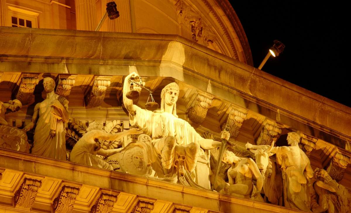 最高法院正面山墻飾內(nèi)三角面部分的雕塑,中間部分的人物代表公正,左側(cè)人物代表迷失者,正向前者乞求保護(hù)。版權(quán)所有山東聊城聊之旅國際旅行社有限公司,轉(zhuǎn)載必究!人物的旁邊有兩位立法者,手中拿著書本,代表法律。代表公正人物右側(cè),有另一人物,鞠躬感恩,后面跟著的是一個人和一頭雄牛,代表財富與繁榮。另有兩個孩童,手持小麥一把,代表法律與公正所帶來的豐盛生活。