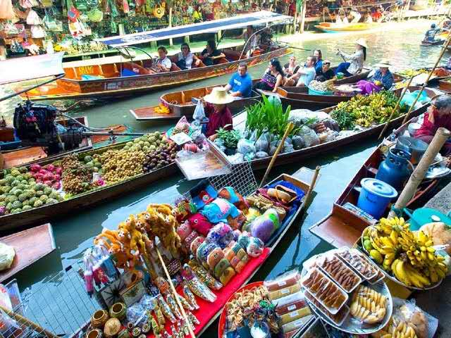 每天早上約7點到9點,是當地人交易最頻繁的時候,會有一艘接著一艘的小船從附近駛來,賣時蔬水果、干貨、小吃、鍋碗器皿、草帽等,在船上煮米粉、剖椰子都是輕而易舉的事情。店家各持一艘船,景象實在壯觀。約莫10點左右,除了小販的船外,更多了載觀光客的船,有時河道可能也會被擠得水泄不通,出現難得的「塞船」景象,不過這里有水上警察吹哨音指揮,紓解交通,很快就能讓河面再度活絡起來。