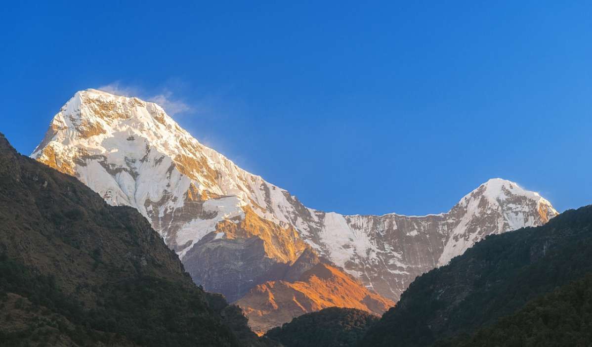 魚尾峰雖然不是尼泊爾最高的山峰,但卻成為尼泊爾的標(biāo)志。從波卡拉的費(fèi)娃湖附近,可以看到這座圣山和周圍峰群,突出于較低的山巒之上。