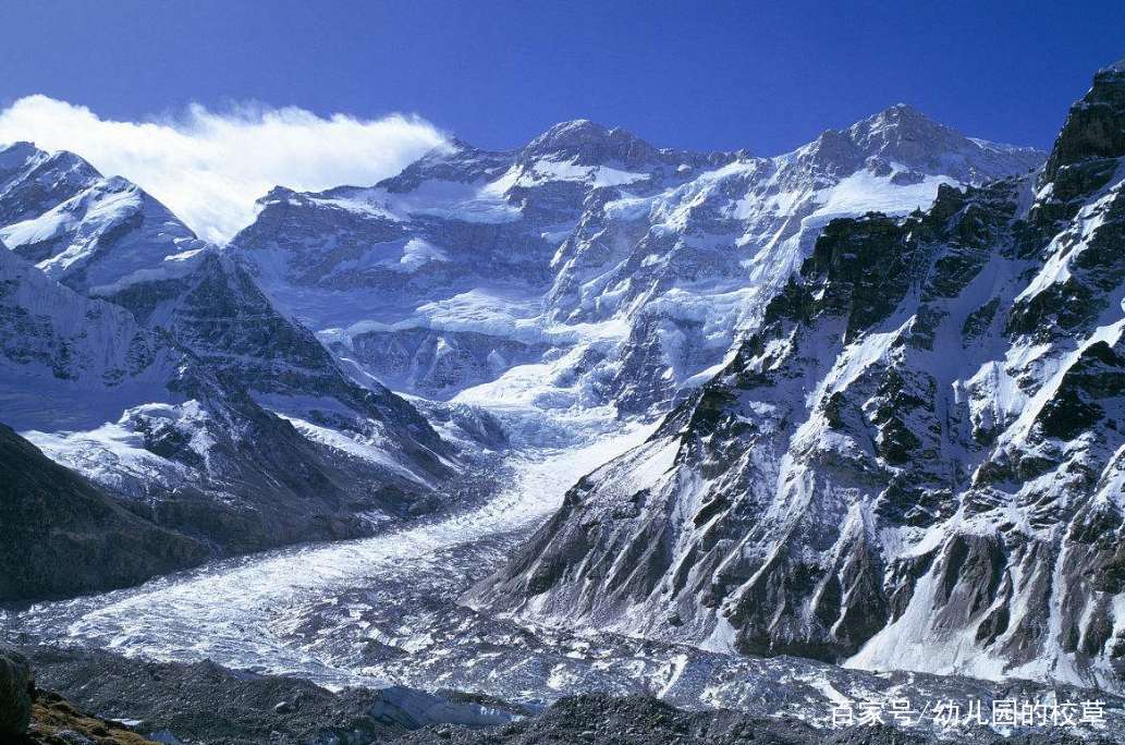 干城章嘉峰山體巨大,有五個峰頂:干城章嘉主峰,海拔8586米;干城章嘉西峰(又叫雅蘭康峰),海拔8505米;干城章嘉中央峰,海拔8473米;干城章嘉南峰,海拔8476米;康巴秦峰,海拔7903米。其間形成眾多山谷冰川,使得山勢更為險峻,冰崩、雪崩頻繁出沒。由于處于孟加拉灣暖濕氣流控制區(qū),降水量非常大,冰雪補給充足,東坡的熱姆冰川長達31公里,面積130多平方公里,它的厚度達到300米。西坡有雅蘭冰川,西北坡還有干城章嘉冰川和普魯爾冰川。這些冰川流動快,冰裂縫較多。這組群峰,受地理位置影響,常常濃云密布,很難露出真面目。
