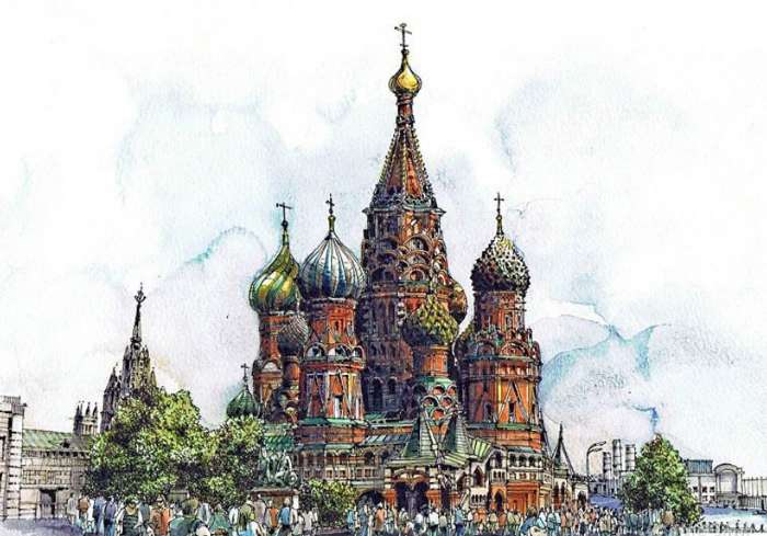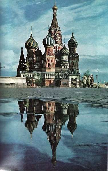 圣瓦西里大教堂于1553-1554年為紀(jì)念伊凡四世戰(zhàn)勝喀山汗國而建(由7個(gè)木制小教堂組成),并于公元1555年—公元1561年奉命改建為9個(gè)石制教堂,造型別致,多奇異雕刻,主臺(tái)柱高57米,為當(dāng)時(shí)莫斯科最高建筑。