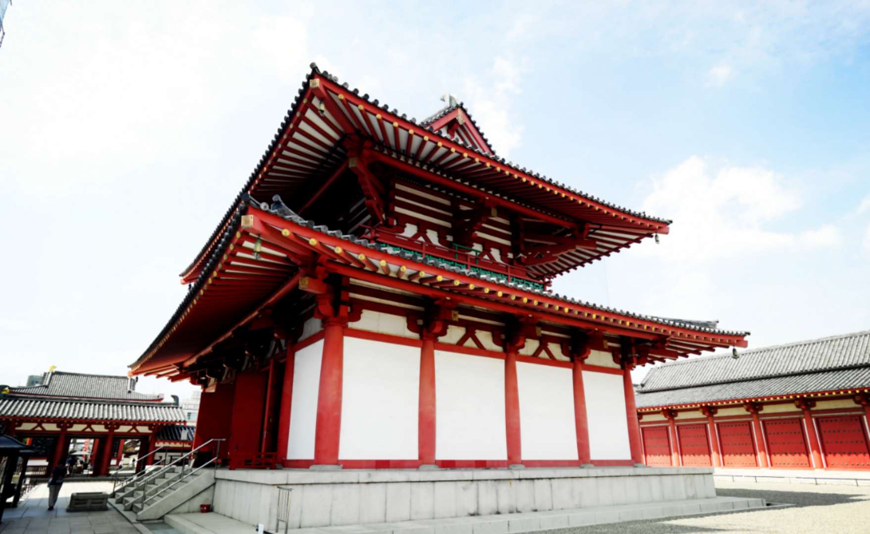 據(jù)《日本書紀(jì)》記載,信奉佛教的圣德太子與反佛教的物部守屋一派開戰(zhàn)前,形勢不利的圣德太子曾向法神四天王像許愿,打敗物部派后將為四天王建立寺院。公元593年,戰(zhàn)勝的圣德太子在大阪建立了四天王寺,這是日本飛鳥時代的代表性寺院建筑。