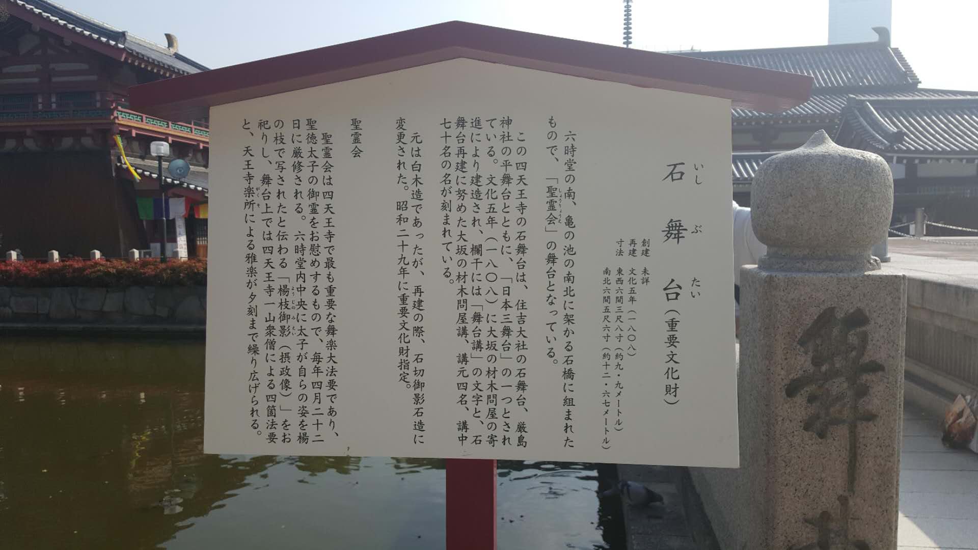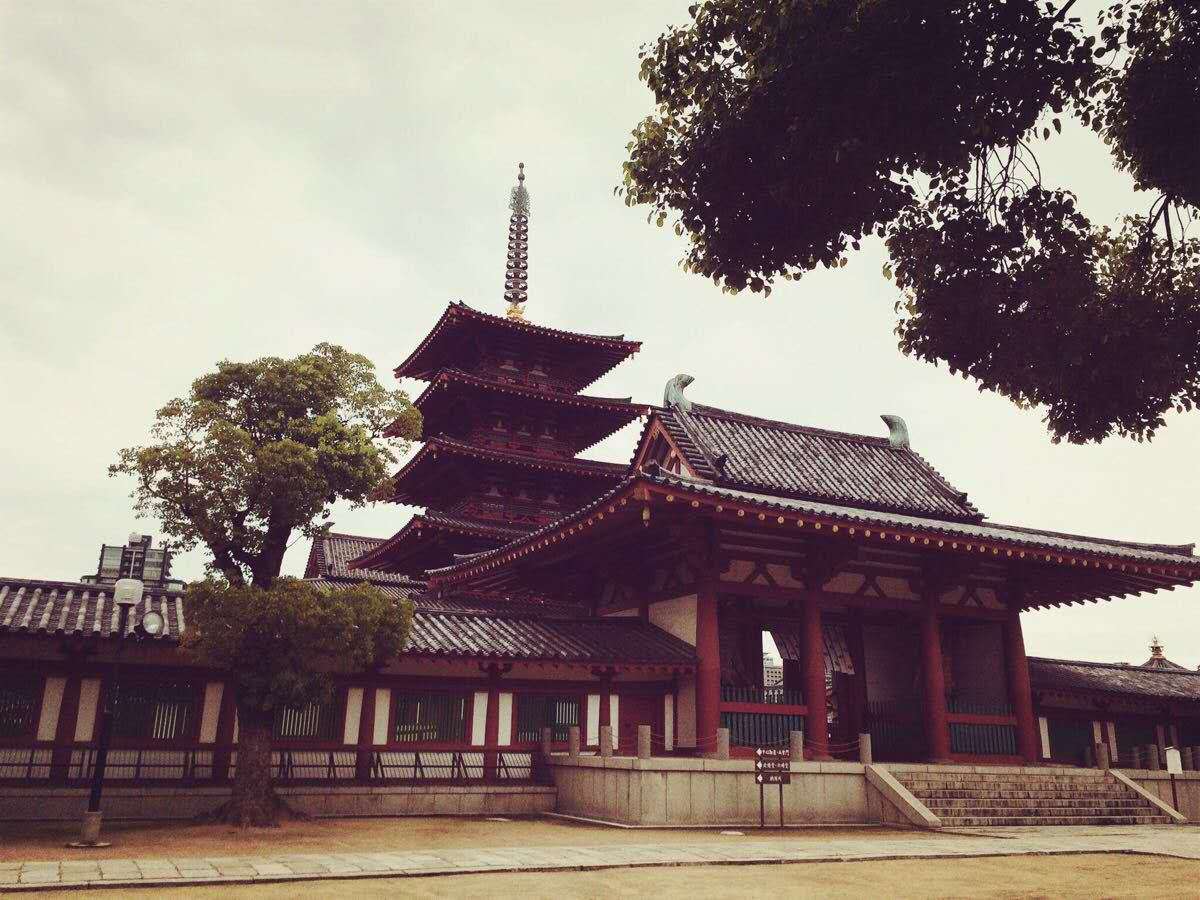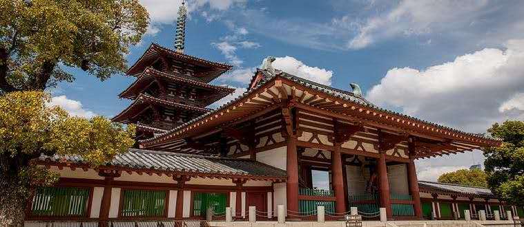 四天王寺是593年由圣德太子所建立的日本佛教最早的寺院,因此它也是日本最古老的官家寺院。它不僅僅作為佛界守護(hù)、鎮(zhèn)護(hù)國家的寺院而成為政治外交的中樞,而且還是美術(shù)工藝產(chǎn)業(yè)等日本文化的發(fā)源地。以后將中門、五重塔、金堂、講堂等呈一條直線排列、外部則由回廊環(huán)繞的建筑模式稱為“四天王寺式”,其模式來源應(yīng)為中國和朝鮮半島。雖然殿堂、寶塔、寺院多次遭遇戰(zhàn)炎和天災(zāi)和毀壞,但每次都得以重建,所以至今仍保持著最初建造時的飛鳥時代的雄姿,充分體現(xiàn)了這座寺廟的悠久歷史和它在大阪人心中的地位。