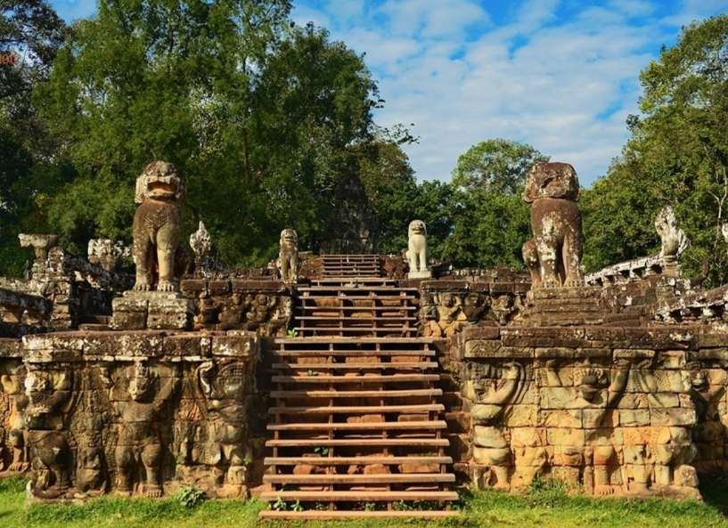 吳哥的斗象臺(tái)建於十二世紀(jì)末,也是賈耶跋摩七世的年代。臺(tái)的長(zhǎng)度超過三百米,共有三個(gè)平臺(tái)。版權(quán)所有山東聊城聊之旅國(guó)際旅行社有限公司,轉(zhuǎn)載必究!南部的梯級(jí)以三頭飾的大象為柱,象鼻卷著蓮花。平臺(tái)的墻壁則雕上獅子和神鳥。