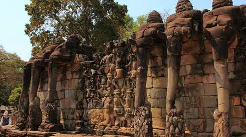 斗象臺(tái)(Elephant Terrace)出了巴戎寺繼續(xù)往北走,不遠(yuǎn)處就到了斗象臺(tái)。這里是吳哥國(guó)王選坐騎的地方,周邊的圍墻上雕有許多大象和印度教的神像,有些雕像都還很完整,可以看出當(dāng)時(shí)精湛的藝術(shù)造詣……