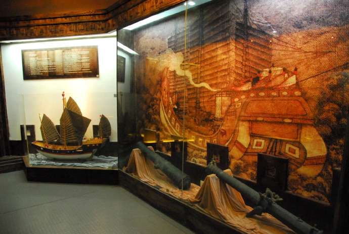 在陳列櫥里,有鄭成功佩帶的玉帶、龍袍殘片、鞋子、圖章等遺物。在詩畫資料中,有鄭成功的詩作及其手書、《鄭成功與王忠孝對奕圖》、《海上見聞錄定本》、延平王戶官楊英的《先王實(shí)錄》以及《稗海紀(jì)游》等,其中《海上見聞錄定本》(共兩冊)是1960年在同安發(fā)現(xiàn)的一部抄本,是非常珍貴的歷史資料。此外,還有雙龍銅炮,以炮身飾有兩條游龍而命名的。