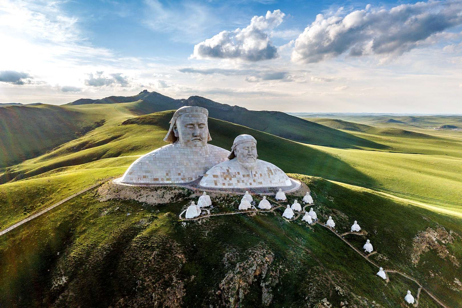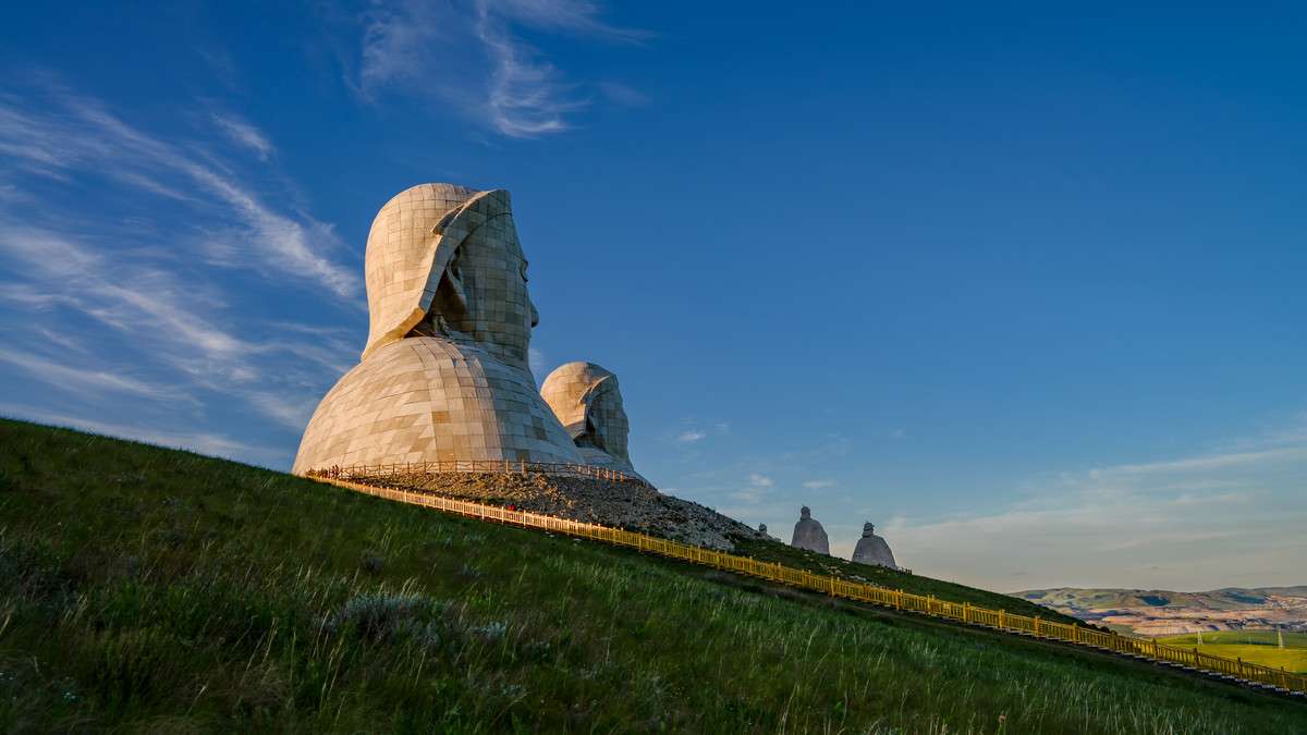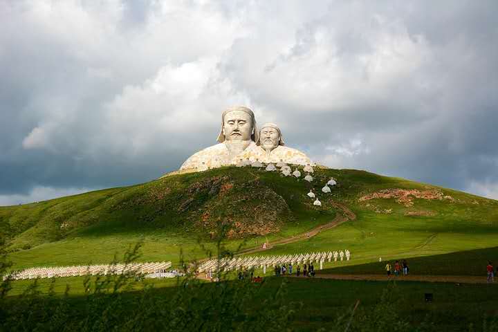 霍林郭勒市可汗山景區(qū)總投資5200萬(wàn)元,占地面積13000余平方米,景區(qū)由山門(mén)、蒼狼之路、蒙元兵陣和蒙古帝王群四部分構(gòu)成,其中成吉思汗頭像雕塑高達(dá)50米。