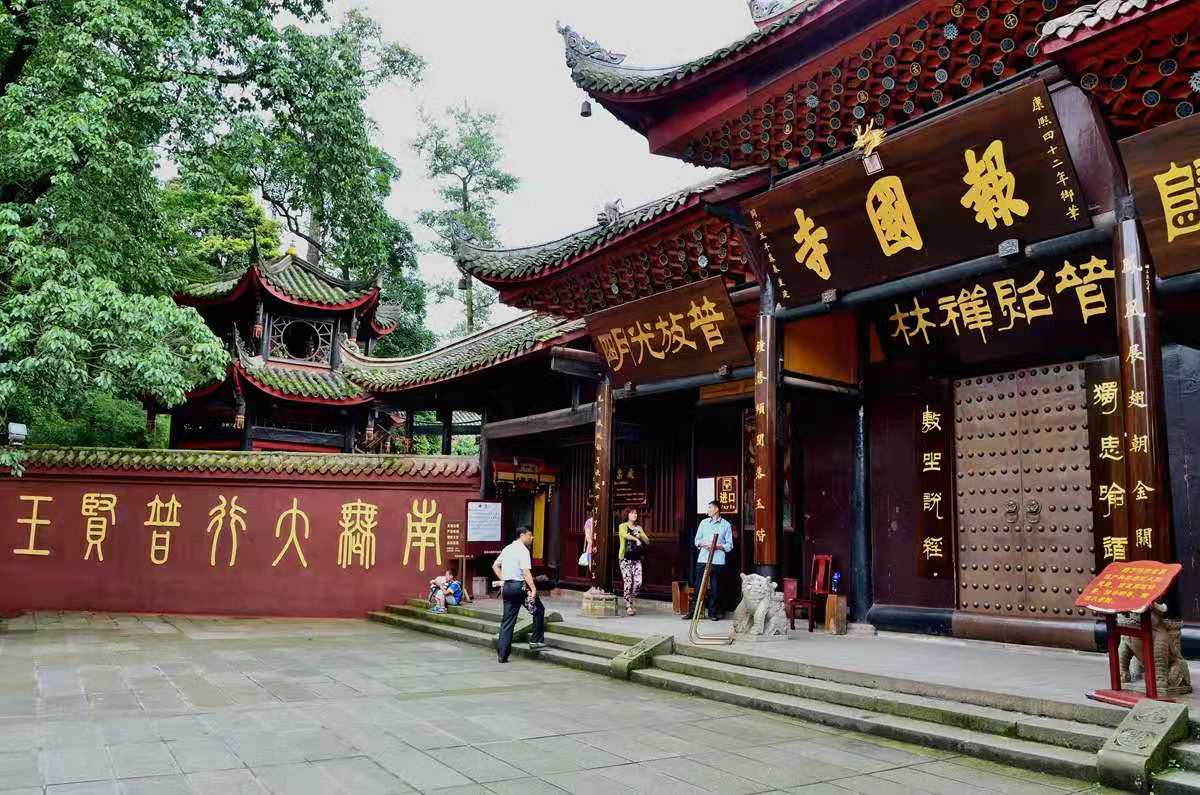 山門的“報(bào)國(guó)寺”大匾,是清康熙皇帝御題,王藩手書。正殿懸有“寶相莊嚴(yán)”匾。山門兩邊柱上那副對(duì)聯(lián)“鳳凰展翅朝金闕,鐘磬頻聞落玉階?!本褪菍?duì)報(bào)國(guó)寺這只“金鳳凰”周圍景物的生動(dòng)描寫。橫匾“普照禪林”和“普放光明”,同是一個(gè)意思:佛教稱峨眉山為“大光明山”,晝有神奇的佛光出現(xiàn),夜有萬(wàn)盞圣燈來(lái)朝,全峨眉山都被光明普照。右邊“鶴駐云歸”,意為鶴停下了,云歸山岫,喻指清涼靜地,含有道家韻味。大門上的聯(lián)語(yǔ):“獨(dú)思喻道,敷坐說(shuō)經(jīng)?!鼻罢呤钦f(shuō)靠自己的思維明白佛經(jīng)的道理,就是佛學(xué)講的“獨(dú)覺(jué)”境界。后句是說(shuō)高僧大德鋪設(shè)好法座向弟子講經(jīng)說(shuō)法。