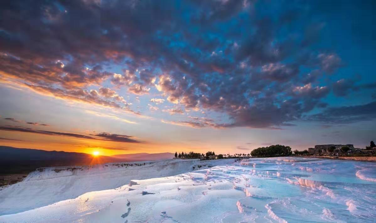最不能錯(cuò)過棉花堡的日落,當(dāng)太陽的光芒一點(diǎn)點(diǎn)由金色變成緋紅殷紅桃紅玫瑰灰,棉花堡會(huì)像一朵最綺麗的蓮花,幻化出難以置信的光影奇跡:白色的巖面會(huì)被陽光點(diǎn)染出淡淡的色彩,而巖面中水波則忠實(shí)地記錄下天空變幻的奇異色彩。