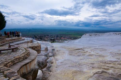 從平原之上200米高的巖石中流出的泉水和水中的方解石形成了帕姆卡拉(土耳其語中意為“棉花宮殿”)這一特殊地貌。它由石林、石瀑布和一系列的梯形盆地組成。公元前2世紀末阿塔利德斯王朝的帕加馬國王們建立了希拉波利斯溫泉站。這處遺址包括浴室的廢墟、廟宇和其它希臘建筑。