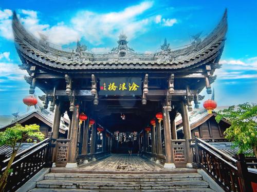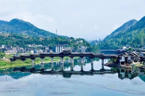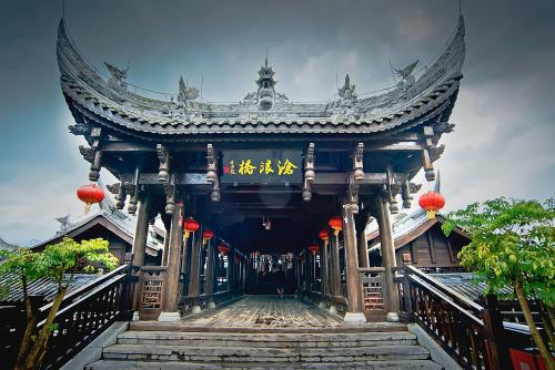 黔江濯水古鎮(zhèn)風(fēng)雨橋橫跨于阿蓬江上,長(zhǎng)303米、寬5米,據(jù)說(shuō)是亞洲最長(zhǎng)的廊橋,分為橋、塔、亭三部分。濯水古鎮(zhèn)風(fēng)雨橋橋身為純木制結(jié)構(gòu),建筑材料之間以榫頭卯眼互相穿插銜接,直套斜穿,結(jié)構(gòu)牢固精密。橋建有三層塔亭,兩側(cè)有約百扇可自由開(kāi)合的雕花木窗,橋內(nèi)擺放有紅漆長(zhǎng)凳。