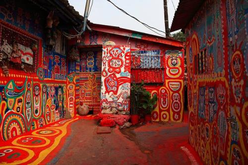 起源于住在臺中市南屯區(qū)嶺東科技大學(xué)附近有一處舊眷村的八十七歲老榮民黃永阜,因?yàn)椤笩o聊」而拿起畫筆彩將眷村內(nèi)的巷弄街道當(dāng)成了天然的畫布,在上頭彩繪了各式美麗的彩虹線條與可愛動物,不僅染亮了小村,在網(wǎng)路上引起熱烈討論,更形成一股參訪風(fēng)潮。黃永阜先生86歲時開始作畫,他用自己手中的畫筆在眷村老舊的房屋和街道上勾勒出一個色彩斑斕的童話世界。老人最初只是在自家的屋里屋外用畫筆描繪心事,打發(fā)時光。后來不少鄰居被他充滿童真的畫所吸引,也邀請他去作畫,就這樣老人在無意中創(chuàng)造了一段色彩繽紛的傳奇。如今,他所居住的位于臺中市春安里的眷村被人們賦予了一個好聽的名字:“彩虹眷村”,并成為了當(dāng)?shù)氐臒衢T景點(diǎn),每年吸引約50萬人前來參觀,而香港籍退伍老兵黃永阜則被人們親切地稱為“彩虹爺爺”。走進(jìn)“彩虹眷村”,地面上、墻壁上畫滿了色彩艷麗、造型俏皮的兔子、小雞、猴子、小鳥、卡通人物、花朵、太陽以及彩虹等。紅色、黃色、藍(lán)色、綠色、白色,絢爛的色彩和極富想象力的線條,讓人們馬上置身于童話世界中。村口那條數(shù)十米長的巷道是“彩虹爺爺”作畫最多的地方,也是最熱鬧的地方。這里的畫色調(diào)明艷、熱烈,地上用油漆涂成了紅底,上面用白色和黃色等勾勒出小鳥、小雞和兔子等造型;墻上則分區(qū)塊時而以藍(lán)色為背景、時而以白色或黃色為背景,上面畫了數(shù)百卡通造型的猴子、貓和孩童。