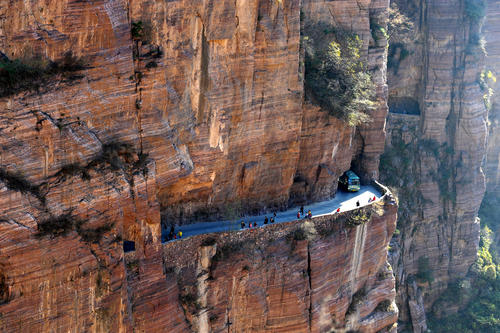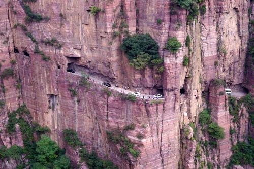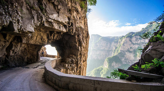 太行山大峽谷中共有六條掛壁公路,其中數(shù)郭亮村到王莽嶺的“昆山隧道"最為壯觀(郭亮村到王莽嶺最近的一條路),歷經(jīng)30年,人工開鑿了一條由山西陵川王莽嶺通往河南輝縣郭亮的掛壁公路。
