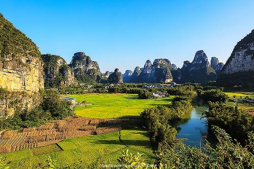 明仕田園位于靠近中越邊境的廣西省崇左市大新縣堪圩鎮(zhèn),距離南寧210公里,距離著名的德天大瀑布37公里。由于明仕田園距離大海不遠(yuǎn),又位于北回歸線以南的熱帶地區(qū)。這里一年四季高溫多雨,以石灰?guī)r為主體的山脈很容易受到水的侵蝕,大自然就以自己的偉力雕塑了明仕田園的喀斯特地貌。在大自然無聲寂靜的歲月流逝中,明仕田園的山總是傍著水,水總是環(huán)繞著山,山總是點(diǎn)綴著水,水總是倒映著山,形成了處處奇峰、山水相映的中國山水。有人放言,在名仕田園沒有真正的攝影家,因?yàn)殡S便一拍,皆是風(fēng)光迤邐的水墨山水。