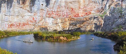 廣西左江流域的寧明、龍州、崇左、扶綏、大新、天等、憑祥等縣市的沿江地區(qū)都分布有崖壁畫,共79處,這些崖壁畫多集中在江河轉彎處寬大、平整、垂直壁上,陸地石壁和洞穴也有少量分布,花山崖壁畫是其中規(guī)模最大的,全幅畫長135米,高44米,分布在寧明縣明江耀達河段的花山崖壁上,畫有朱紅色人物1300多個;最大的高達3米,最小的僅0.3米,間有少量獸類和器具,規(guī)模宏大,內(nèi)容十分豐富。所畫人物有雙腳“八字”蹲、兩手上舉和雙腳下彎、兩臂前撐等姿態(tài)。每組畫中,常見一高大的人位于人群中央,腰佩刀劍,旁邊有銅鼓、狗和馬等形象,似是作戰(zhàn)會師、慶祝大會或集體娛樂等場面。據(jù)專家考證,這些崖壁畫繪制于戰(zhàn)國早期至東漢之間,是壯族先民通過圖騰崇拜以祈求五谷豐登、人丁興旺,其線條粗擴,造型古樸,歷經(jīng)數(shù)千年風雨侵蝕,依然清晰可見,不僅在廣西,在世界上也極為罕見。