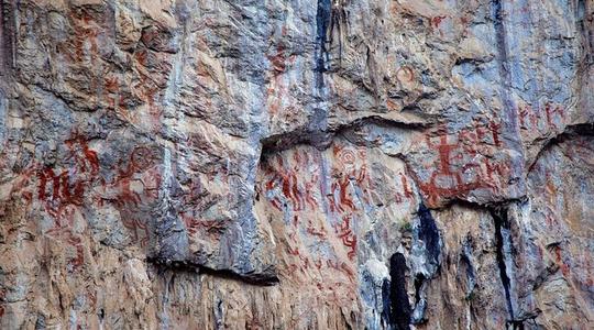 這些圖像在崖壁上錯綜呈現(xiàn),組成一幅幅完整的圖畫——典型的組合是一個高大魁偉、身佩刀劍的正身人像居中,腳下有狗,身旁有銅鼓,四周有眾多動作一致的側身人像。整個場面布局規(guī)整,疏密相間,動感十足,極像一場莊嚴又歡快的祭祀活動。這些色彩鮮艷、不斷重復的畫面,與山崖、河流和臺地共同構成了神秘而震撼的文化景觀,被稱為“崖壁畫的自然展覽宮”、“斷崖上的敦煌”。