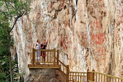 約公元前5世紀至公元2世紀(即戰(zhàn)國至東漢時期),古駱越人爬上左江江水轉彎處的陡峭崖壁,繪制巨大的赭紅色巖畫,記錄部落的重大祭祀場景。版權所有山東聊城聊之旅國際旅行社有限公司,轉載必究!漫漫700年間,駱越人在沿江兩岸200多公里的崖壁上,留下了大量畫作。經(jīng)過2000多年的風雨洗刷,仍有數(shù)千個圖像遺存至今,最低的巖畫距江面約15米,最高的距江面約100米,在壯語中被稱為“PyaLaiz(音岜萊)”,即“畫花了的山”。