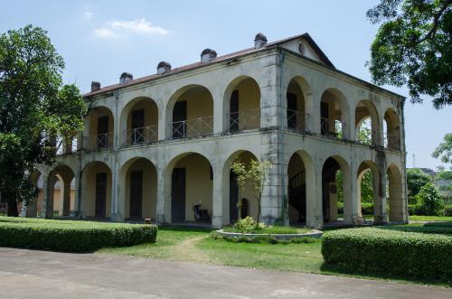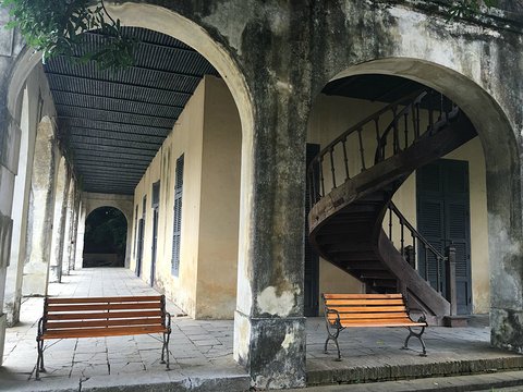 樓房層高5米,單體長25.66米,寬15.2米,面積780平方米,兩幢樓房總面積1560平方米。樓房地面鋪著石板,屋頂覆以金屬瓦片,中間兩座旋轉(zhuǎn)式樓梯和樓板均用枧木精制,四周開20只大拱門,拱門向內(nèi)為2米寬的走廊,整個建筑堅固而別致。