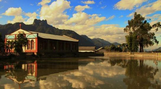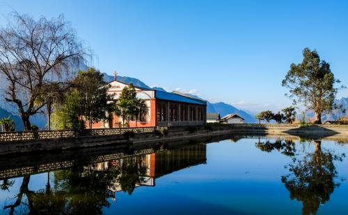 老姆登教堂,青磚墻,紅漆木窗,白鐵皮屋頂,簡單樸素。從外表看,這座教堂并不壯觀,沒有常見的玻璃彩窗、穹頂、和標志性的哥特式尖塔,有的只是長條凳和紅漆木窗,但這更顯出人們信仰的純粹和虔誠。每個星期天(周三、周六晚上八點亦有),周邊鄉(xiāng)村的基督教信徒都會集中在這里做禮拜,他們聚集在這里虔誠的念誦贊美詩,對于那些和著太陽和泥土味道的樸實的人民,上帝就住在他們心里,他們像呼吸一樣自然安詳虔誠的哼出那些歌謠。村民唱圣歌是用傈僳語唱的,傈僳族的文字始自圣經(jīng)的翻譯,也為怒族所共用。