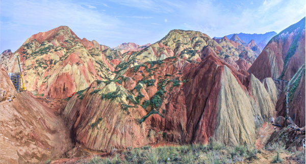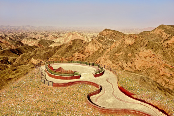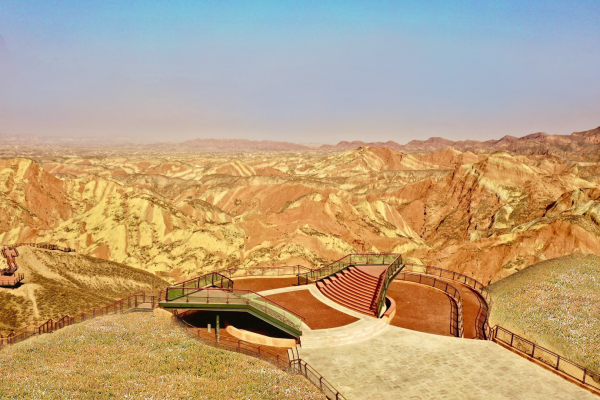 九色丹青觀景平臺九色丹青觀景平臺海拔1748米,平臺的造型宛若一把琵琶橫鋪在丹霞崖壁之間,遠遠望去,渾然天成。這里彩色的千巖萬壑仿佛觸手可及 ,色彩斑斕的丘陵仿似上帝的調(diào)色板,富含石青、石綠、朱砂、白堊、黃赭石等三十余種礦物質(zhì)的巖石在陽光的照射下,各種色彩濃烈地交織在一起,色調(diào)或如波浪順著山勢起伏,或從山頂傾瀉而下,山形肌理狀若潑墨山水,美不勝收。