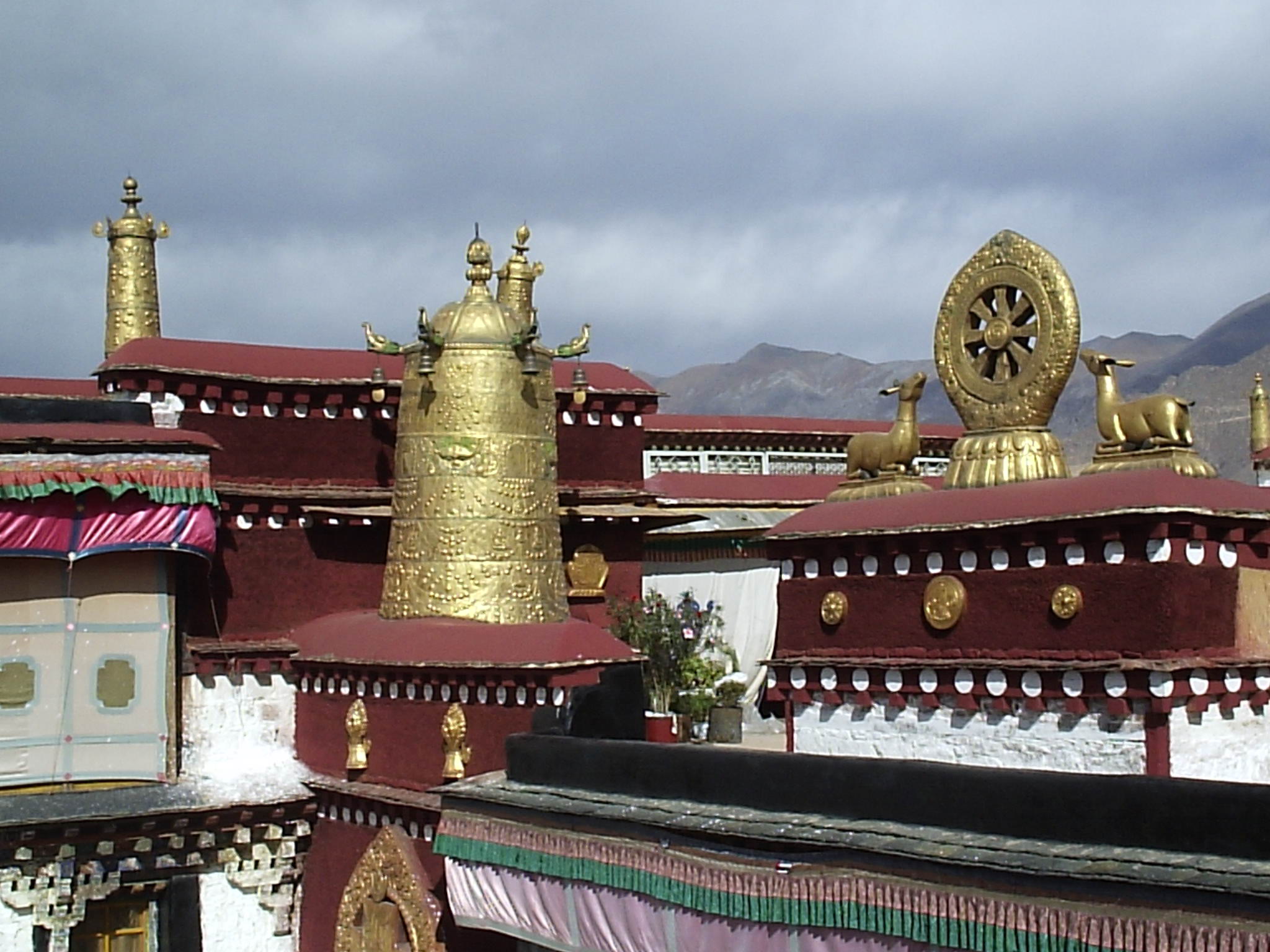 從大昭寺金頂俯瞰大昭寺廣場,右邊遠(yuǎn)處山上是布達(dá)拉宮,近處的柳樹是“公主柳”,相傳是文成公主所栽。大昭寺的布局方位與漢地佛教的寺院不同,其主殿是坐東面西的。主殿高四層,兩側(cè)列有配殿,布局結(jié)構(gòu)上再現(xiàn)了佛教中曼陀羅壇城的宇宙理想模式。寺院內(nèi)的佛殿主要有釋迦牟尼殿、宗喀巴大師殿、松贊干布殿、班旦拉姆殿(格魯派的護(hù)法神)、神羊熱姆杰姆殿、藏王殿等等。寺內(nèi)各種木雕、壁畫精美絕倫,空氣中彌漫著酥油香氣,藏民們神情虔誠地參拜轉(zhuǎn)經(jīng)。