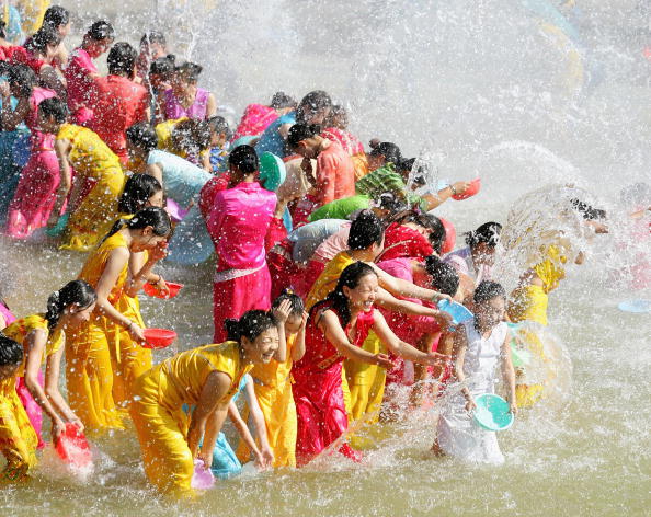 人們先至佛寺浴佛,然后互相潑水,用飛濺的水花表示真誠的祝福。到處歡聲笑語,充滿了節(jié)日氣氛。