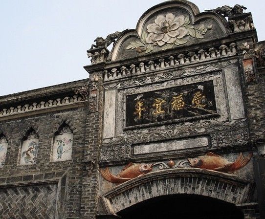 老公館大門整體足有兩層樓高,主體為灰磚墻,勾白縫。一對朱砂色石獅雄踞兩側,黑漆木門門楣上一對紅色鯉魚相向翹尾,兩個魚嘴似在爭搶中間的白珠。其上有四個描金大字——受富宜年,襯了黑底,兩側拉白瓷條飾。最上部為凸型拱邊,居中一朵粉紅色牡丹浮出墻面。整座大門裝飾繁復,色調沉穩(wěn)大方。
