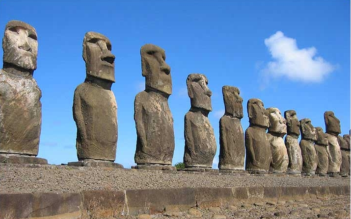 復(fù)活節(jié)島以其巨大石雕像而著名,島上有約600座以上的大石雕像,以及大石臺(ahu,石堆)遺跡,其朝陸地方向有露天庭院,某些庭院建筑巧妙。1886、1914和1934年進行考古調(diào)查;1955年開始考古發(fā)掘工作。結(jié)果認為島上存在3個明顯的文化期。早期有在塔海(Tahai)、維納普和阿納克納的大石臺,碳定年法測定約在西元700~800年。科克上校贊賞最早的兩個大石臺,并加以描述;阿納克納石臺的墻在1987年挖掘出以前,一直埋在地下。從阿納克納發(fā)掘工作中發(fā)現(xiàn)多種石雕像是在早期雕刻的,其中有一種較小的中期胸像原型,與中期胸像的主要差異是圓頭和粗壯的身軀。另一種型式是一尊寫實主義雕像,表現(xiàn)跪著的全身人像,臀部坐在足跟上,雙手放在膝上,有一個雕像裸露著肋骨,具備著南美洲蒂瓦納庫(Tiwanaku)的前印加人時期紀(jì)念物的各種特點。在中期(1050?~1680),有意毀壞和丟棄石雕像,所有大石臺全部重建,沒有考慮太陽方位,也沒有考慮石塊結(jié)構(gòu)的尺碼。似乎唯一愿望就是能夠有牢固石臺,可以支撐更高更大的胸像,即中期典型的“莫埃”(moai)。