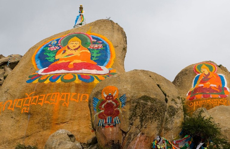 措欽大殿里還保存有二到四世達賴喇嘛的靈塔。大殿四壁,繪有許多精彩壁畫,有釋迦牟尼的百行轉(zhuǎn)圖、人間形成圖、生死輪回圖等。措欽大殿東邊有一個半地下的很小的山洞,只能容一個人進入,名叫“讓迥瑪”。它原來是宗喀巴關靜修的地方,也是哲蚌寺最早的建筑。
