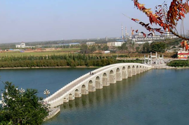 又名十七孔橋,是東阿縣跨度最大的一座橋。由十七個橋孔組成,總跨度142米,水面高度9.9米,它似一條玉帶,鑲嵌在碧波蕩漾的洛神湖上。