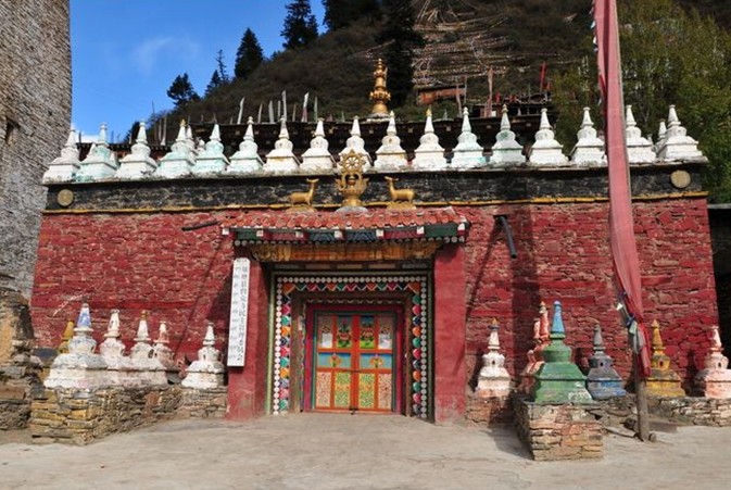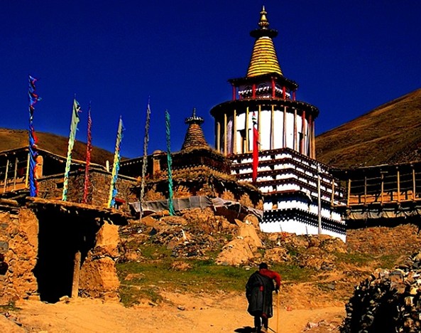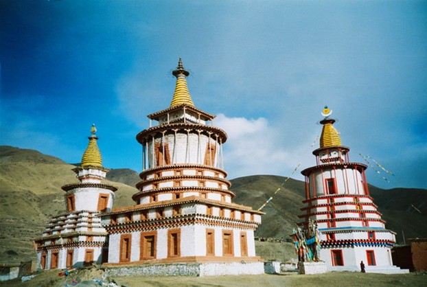 覺囊寺坐落在日喀則拉孜縣歐布瓊山山腰處,海拔4600米。始建于公元十二世紀(jì),由貢巴•土杰尊珠主持修建。該寺曾有二萬多名僧人,在歐布瓊山上有二千多處修行洞和坐禪房,并修建了一座“萬佛一見得解塔”,塔高約27米,塔型呈“時(shí)輪壇城”,有108個(gè)門、108個(gè)殿堂。主供佛為喜繞堅(jiān)贊師徒三尊佛。每年藏歷4月15日,該寺舉行“時(shí)轉(zhuǎn)跳神”活動(dòng)。