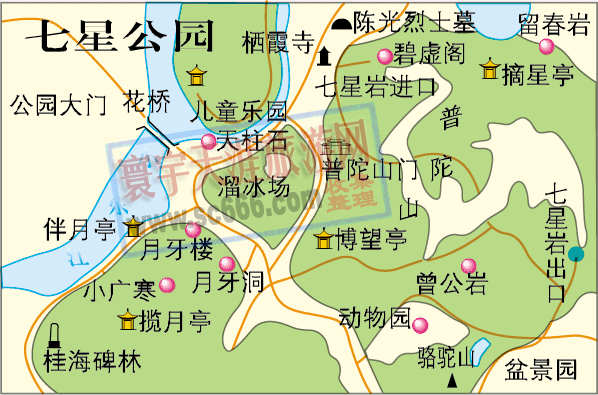 公園內(nèi)有“北斗七星”、“駝峰赤霞”、“月牙虹影”、“普陀石林”等勝景, 占有山、江、洞、石之美。著名景點有七星巖、龍隱洞、月牙巖、曾公巖、駱駝山、龍隱巖和花橋、月牙樓、兒童樂園、動物園、三將軍及八百壯士墓、清真寺、盆景藝苑、桂海碑林等。