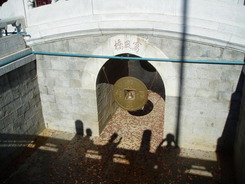 始建于清康熙四十五年(1706),后毀壞。1988年重建。為南北向的單孔石橋。橋下并無水。橋洞兩側(cè)各懸一枚古銅錢模型,刻有“鐘響兆福”四字,錢眼內(nèi)系一小銅鐘。那么,為什么要修建一座橋呢?據(jù)說,由于北方風(fēng)猛雨少,觀外原有座“甘雨橋”,人們便在觀內(nèi)修了這座“窩風(fēng)橋”,兩座橋象征風(fēng)調(diào)雨順之意。 另有一說為紀(jì)念全真教創(chuàng)始人王重陽而建,據(jù)說王重陽棄家出游,在陜西甘河橋遇異人授予他修煉真訣,于是出家修道,創(chuàng)建全真教。后世全真弟子修建“甘河(干河)橋”以為紀(jì)念。