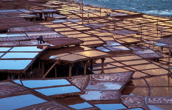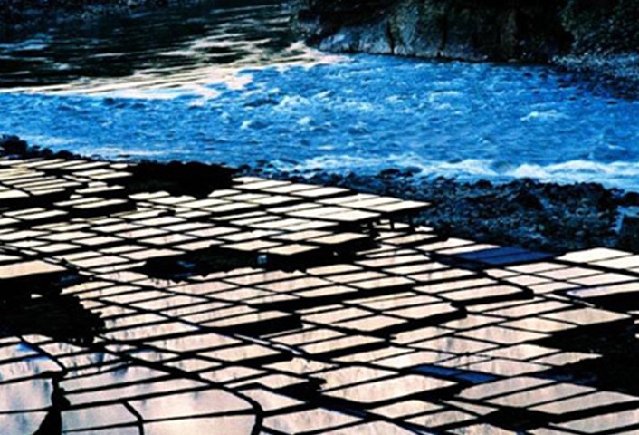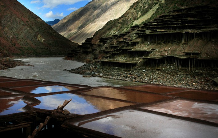 鹽井自古就有產(chǎn)鹽的歷史,而鹽田又成為這里獨有的一道人造景觀。所謂的鹽田,其實是在洶涌澎湃的瀾滄江邊搭建的一些土木結(jié)構(gòu)的平臺。順著鹽田之間的小道下坡,鹽水井就挖在江邊。這兒的鹽水井有的深近10米,工人們身背圓柱形的木桶,將鹵水存儲在鹽田邊的槽溝里,其他的工人將鹵水從槽內(nèi)舀出倒入鹽田里。經(jīng)過一天日頭的暴曬和江風的吹拂,第二天,鹽田里就會結(jié)晶出白色的鹽粒了。 依山搭建層層的鹽田氣勢雄偉,鹽民們沿著祖先的足跡,走在崎嶇險峻的小道上辛勤地勞作,在延續(xù)生命的同時也創(chuàng)造著世界上獨特的景觀。