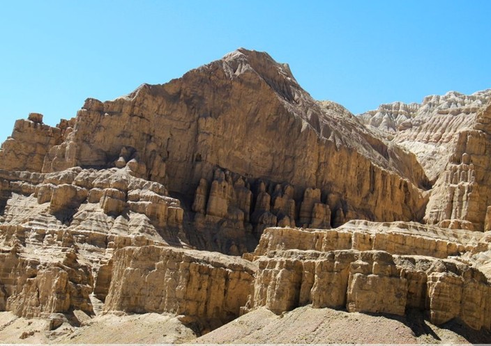 隨著高原不斷上升,湖盆相對下陷,在數(shù)百萬年間,湖盆中積累了厚達1900米的堆積物,主要是夾有礫卵石層的棕黃、褐色或灰黃色的半膠結(jié)細粉沙層,不僅外貌酷似黃土,而且由于有鈣質(zhì)膠結(jié),具有類似黃土的直立不倒與大孔隙等性質(zhì),為以后風(fēng)雨和流水雕琢成各種地貌造型提供了最基本的物質(zhì)基礎(chǔ)。扎達湖盆在數(shù)百萬年間經(jīng)歷了滄桑巨變,早期是亞熱帶森林草原氣候,在海拔大約2500米的海濱,馳騁著以三趾馬和小古長頸鹿為主的動物群,湖中生長著似天鵝絨鸚鵡螺和介形蟲等淡水生物,后期氣候逐漸轉(zhuǎn)涼,過渡到溫帶森林到草原氣候。