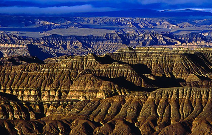 立于盆地之中,旅者可以深深體會到大自然的偉力,更為它的造化所震撼。這扎達盆地里獨特的自然地貌、這地球上規(guī)模最大的一片土林;峽谷與土林層層疊疊,綿延不絕。這是一種獨特的“水平巖層地貌”,是高平的山頂被縱向切割侵蝕成的一條條深深的溝壑,變成了土的林海,但人們更愿意相信,這是一種藝術(shù),一種大地的藝術(shù),就好像是大自然特意造出來、專門是為了向人類展示其魅力似的。這就不難理解為什么那么多的各學(xué)科的科學(xué)工作者——包括人文工作者——都迷戀著扎達的土林。