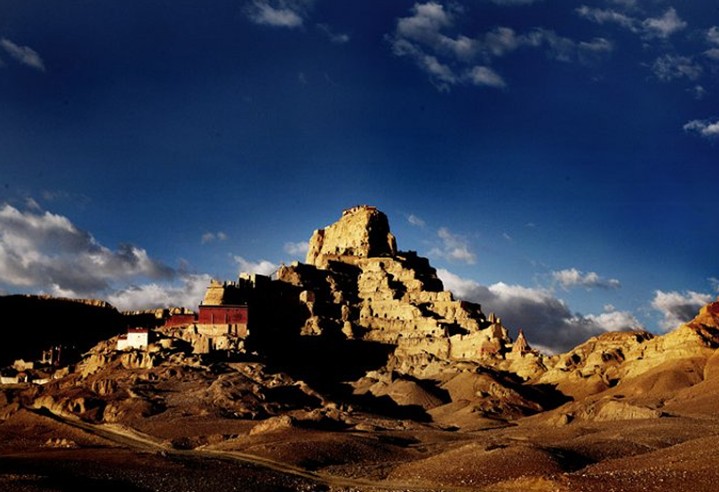 古格王國是在公元十世紀前后,由吐蕃王朝末代贊普朗達瑪?shù)闹貙O吉德尼瑪袞在王朝崩潰后,率領親隨逃往阿里建立起來的。從它的建立就嗅得出悲情的色彩。這個王朝投影到現(xiàn)在,變成了阿里扎達札不讓區(qū)象泉河畔的一座土山,占地約18萬平方米,共有屋洞窟300余處、佛塔(高10余米)3座、寺廟4座、殿堂2間、地下暗道2條的遺跡。