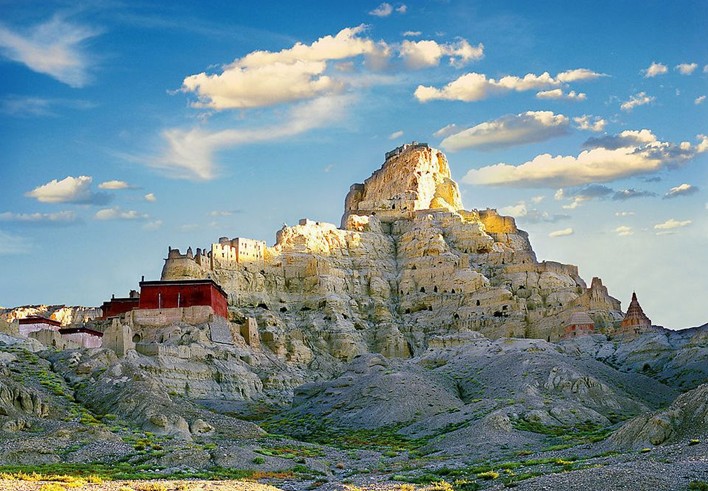 位于阿里地區(qū)的一座土山上。公元10世紀前半期建立,前后世襲了16個國王。王宮城堡是從10-16世紀不斷擴建的。古格王國遺址占地約18萬平方米, 從山麓到山頂高300余米,房屋建筑、佛塔和洞窟密布全山,達600余座,形成一座龐大的古建筑群。