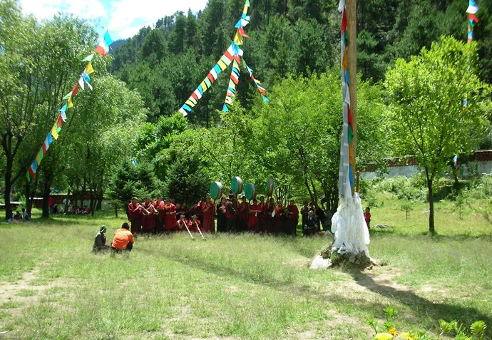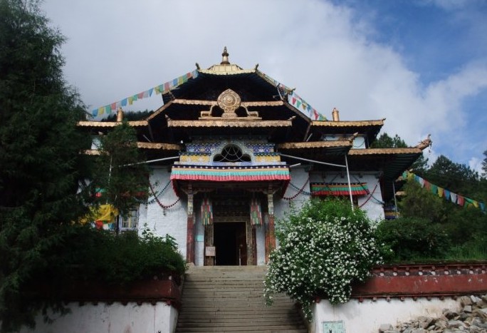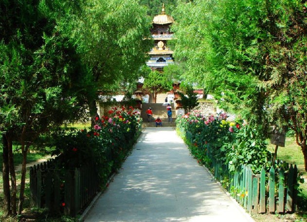 喇嘛嶺寺位于西藏林芝地區(qū)所在地八一鎮(zhèn)東南三十公里處的森林包圍的山坳里。喇嘛嶺寺的金頂與翠綠的松柏交相輝映。寺院經(jīng)堂和僧舍四周,各種顏色的菊花、格?;幭喽菲G,鐃跋聲、鈴鼓聲以及渾厚而又清脆的誦經(jīng)聲回蕩在山谷。這座建于上個世紀(jì)三十年代末的古剎,屬藏傳佛教四大教派之一的寧瑪派(俗稱紅教)寺廟。