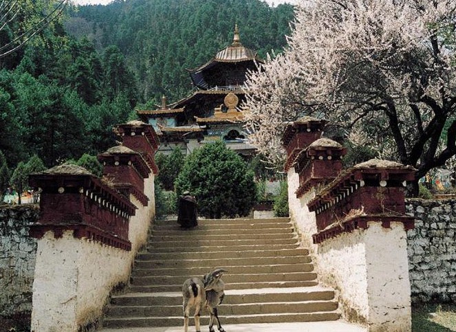喇嘛嶺寺位于西藏林芝地區(qū)所在地八一鎮(zhèn)東南三十公里處的森林包圍的山坳里。喇嘛嶺寺的金頂與翠綠的松柏交相輝映。寺院經(jīng)堂和僧舍四周,各種顏色的菊花、格?;幭喽菲G,鐃跋聲、鈴鼓聲以及渾厚而又清脆的誦經(jīng)聲回蕩在山谷。寺廟喇嘛從小“收養(yǎng)”的兩只灰色盤羊,脖頸戴著小鈴鐺,在寺院草壩上覓食。這座建于上個世紀(jì)三十年代末的古剎,屬藏傳佛教四大教派之一的寧瑪派(俗稱紅教)寺廟。