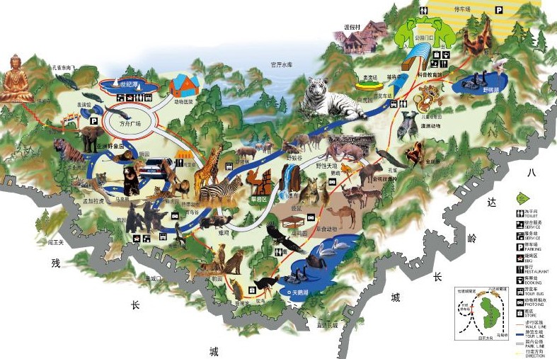 八達(dá)嶺野生動(dòng)物世界設(shè)計(jì)建有30處景區(qū)及一個(gè)小型水庫,其中包括動(dòng)物游覽區(qū)20處;古跡游覽區(qū)2處;表演場(館)4處;植物觀賞區(qū)1處;健身運(yùn)動(dòng)區(qū)2處。園內(nèi)動(dòng)物規(guī)模有47種達(dá)兩千余只(頭)。