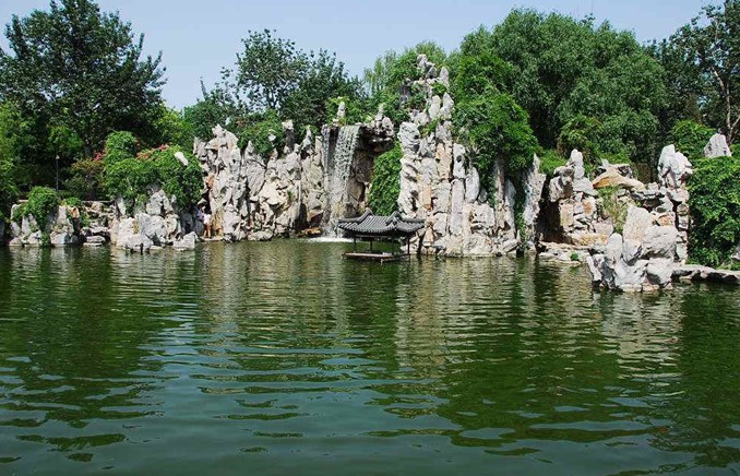 龍?zhí)毒皡^(qū):位于公園北部。巍峨的龍山建于水中,有14座身姿迥異的山峰,瀑布從主峰直瀉而下,遠望似一座巨大的山石盆景。