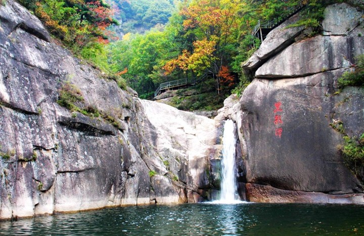黑龍?zhí)蹲湓诿茉瓶h石城鄉(xiāng)鹿皮關(guān)北面的一條全長4公里,水位落差220米的峽谷里,距北京100公里。春花、秋月、平沙、落雁、曲、疊、沉、懸潭等十八個(gè)名潭撒落在幽深振奮峽谷里,千姿百態(tài),各領(lǐng)風(fēng)騷。