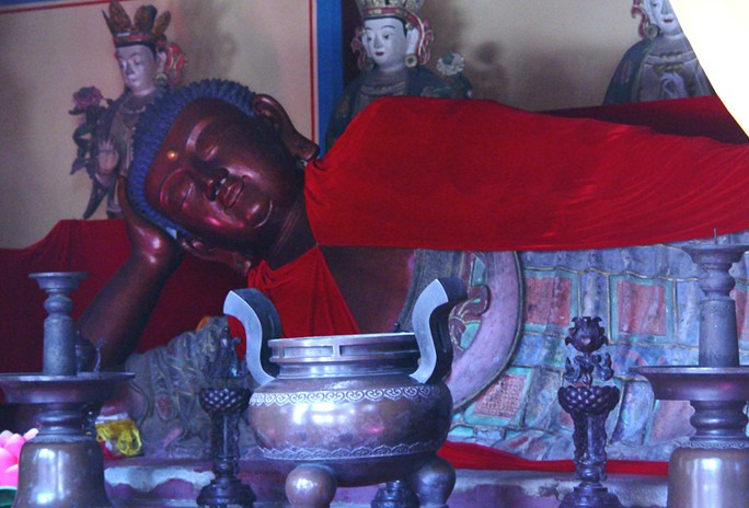 北京西山臥佛寺(Wofo Temple) 由于寺內(nèi)有一尊巨大的釋迦牟尼銅像、臥佛寺由此而得名。臥佛身長5.2米,用銅25000公斤 、鑄佛用工7000人。銅佛作睡臥式,頭西面南側(cè)身躺在一座榻上,左手平放在腿上,右手彎曲托首頭部。據(jù)說這是釋迦牟尼的紀(jì)念像。旁邊站著12尊小佛像,是他的12個弟子。他們的面部表情沉重悲哀,構(gòu)成一幅釋迦牟尼向12弟子囑咐后事的景像。殿的正面墻上掛一塊"得大自在”的橫匾,意思是得到人生真義也就得到最大自由。殿門上方亦有橫匾,書有"性月恒明”,意為佛性如月亮,明亮興輝永照。